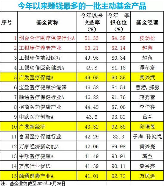數據顯示,截至5月26日,創金合信醫療保健行業A收益率51.33%,暫居主動權益類基金業績榜首,工銀瑞信養老産業同期斬獲50.21%的收益率,兩隻基金年内淨值漲幅紛紛突破50%。
